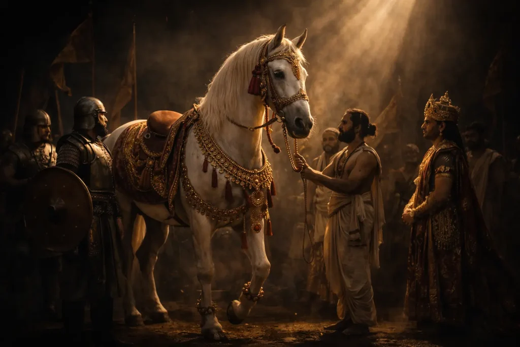 Ashwamedha Yagna represents outward sovereignty and unchallenged rule. Through the symbolic release of a sacred horse, it signifies territorial authority, military strength, and political supremacy. This yagna asserts dominance across lands, reflecting a ruler’s ability to protect, expand, and command, guided by ritual and royal power.