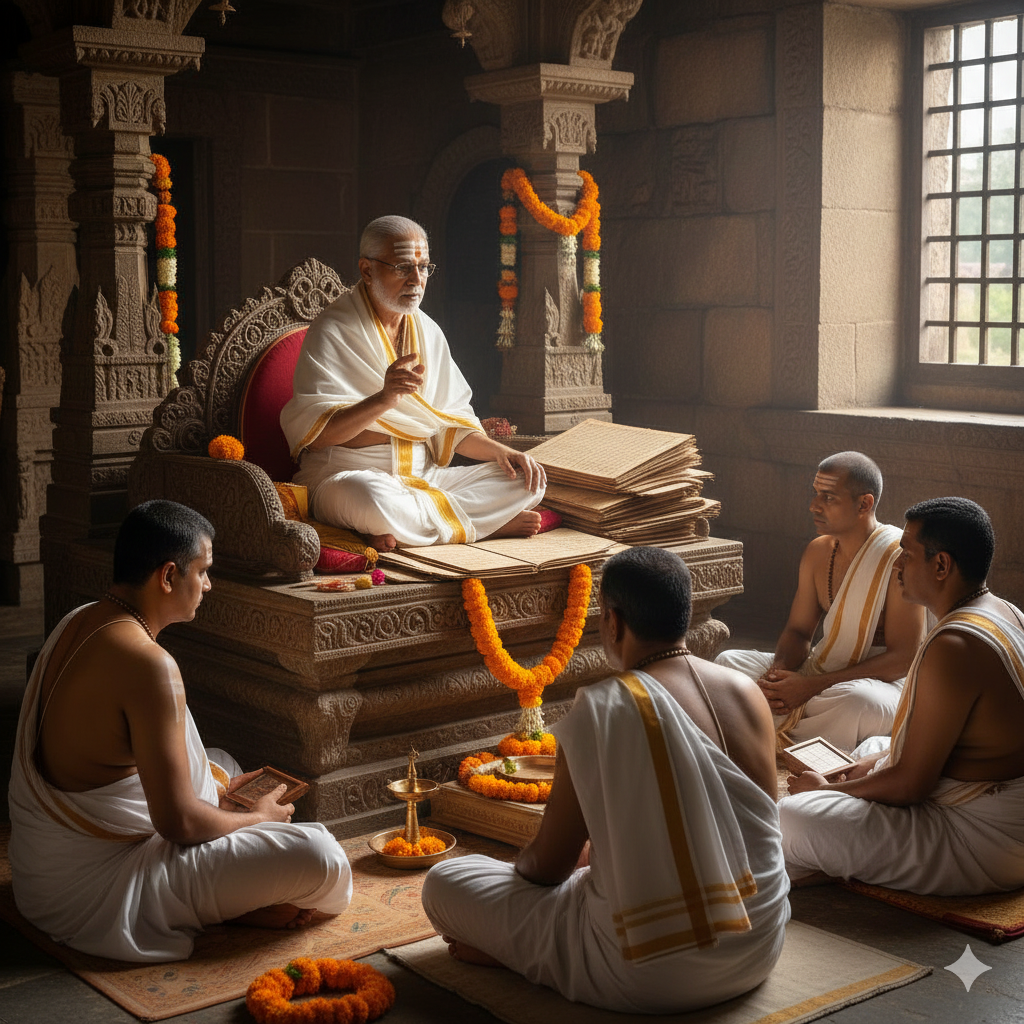 Teaches Mahabharata philosophy, interpreting dharmic lessons and historical narratives to guide ritual practices and leadership principles.