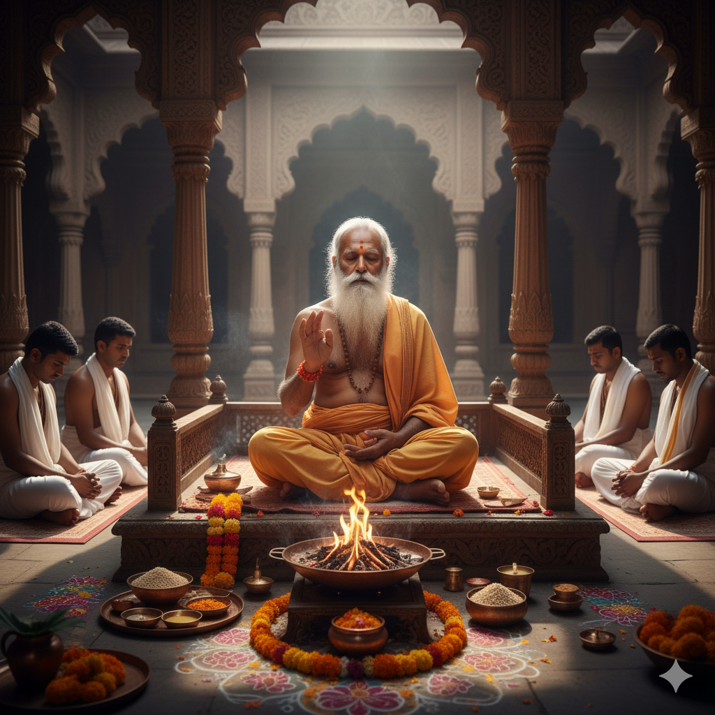 The Chief Yagna Acharya is the supreme spiritual authority guiding the Rajsuya Maha Yagna, ensuring flawless ritual execution, scriptural accuracy, and unwavering adherence to dharmic principles.