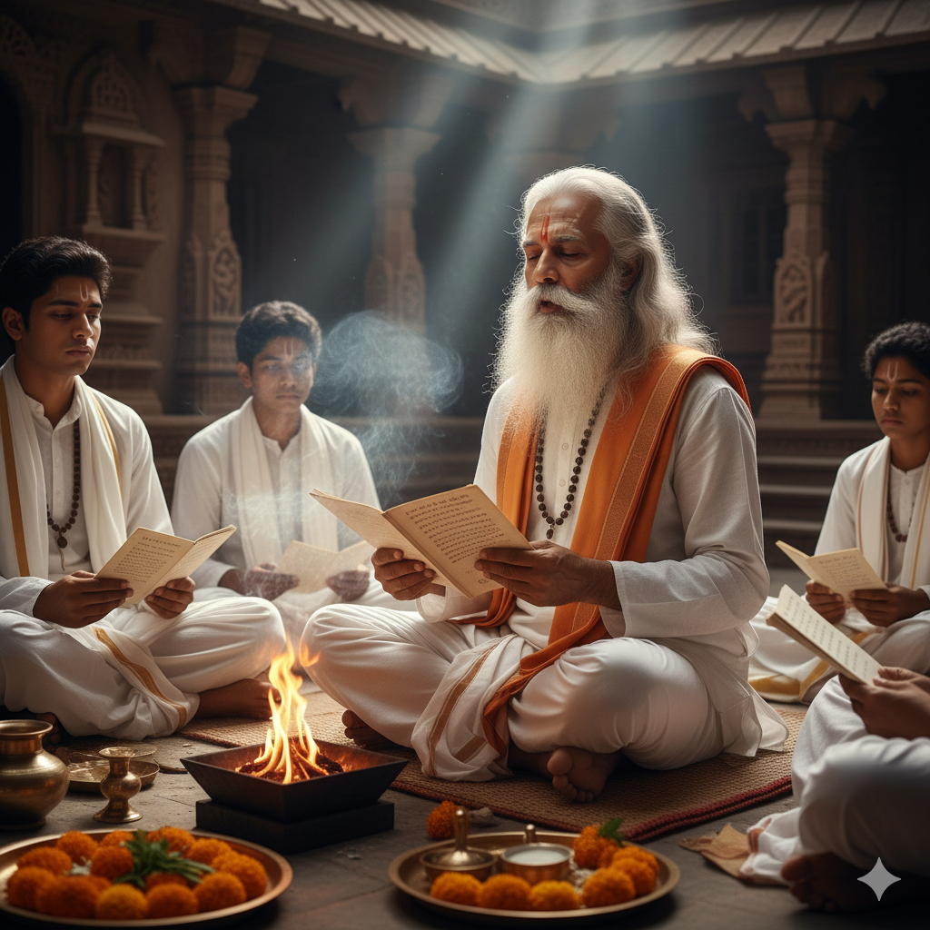 Specializes in Rigvedic hymns, interpreting sacred mantras, and preserving ancient Vedic oral traditions.