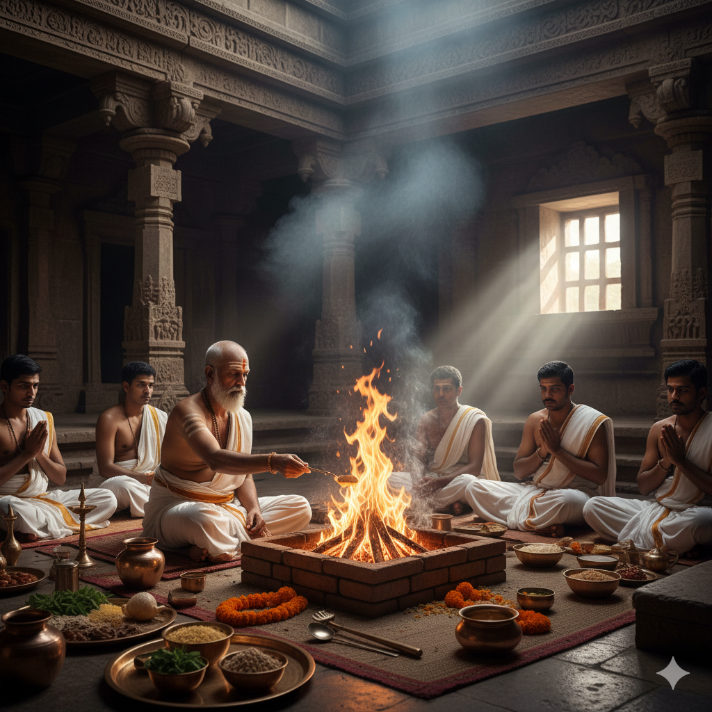 Expert in Yajurvedic rituals, guiding precise fire sacrifices, and performing complex ceremonial sequences during yagnas.