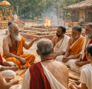 An esteemed Acharya interpreting Vedic philosophy and dharma, guiding participants to understand the deeper spiritual purpose beyond ritual observance.